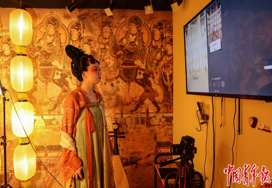 3月9日,北京三里屯,汉服造型师拾一完成“唐宫夜宴”造型,准备用AR体感系统拍摄样片。 中青报·中青网记者 曲俊燕/摄