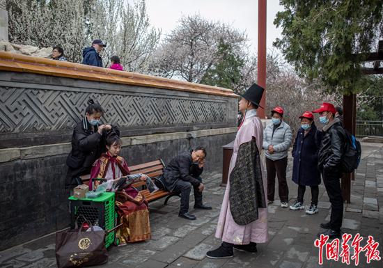 3月18日,北京北海公园,韩爽(左二)与男搭档一起穿汉服拍摄春日主题样片,吸引了游人好奇的目光。 中青报·中青网记者 曲俊燕/摄