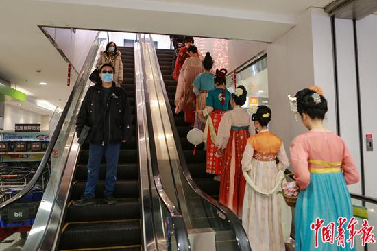 2月26日,当天是正月十五元宵节,北京一家商场内,参加元宵节宣传活动的汉服模特们乘电梯在各楼层“巡游”,吸引了不少关注。当天模特们的造型由韩爽团队操办。 中青报·中青网记者 曲俊燕/摄