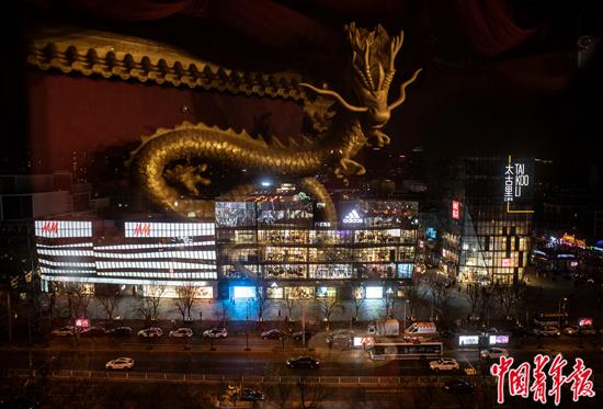 3月16日,北京三里屯,在韩爽的汉服体验馆里,古风布景房间的飞龙造型映在玻璃上,窗外就是繁华的三里屯商区。 中青报·中青网记者 曲俊燕/摄