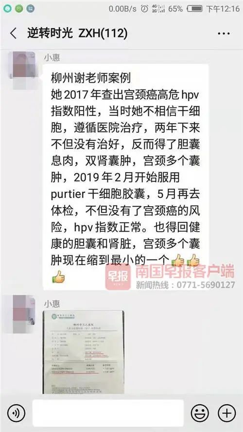 ▲记者了解到,该产品源自新加坡一家名为Riway国际的公司,主推产品就是“Purtier鹿胎盘素”,产品已升级到了第六代。图为微信群里的产品及患者案例信息。