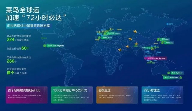 有消息称,菜鸟已经在33个国家构建了供应链网络,并在中国杭州、香港、马来西亚、比利时、泰国、印尼、越南等地部署世界性的枢纽。希望通过区别于传统集装箱运输的方式,以达到“全球72小时达”的目标。
