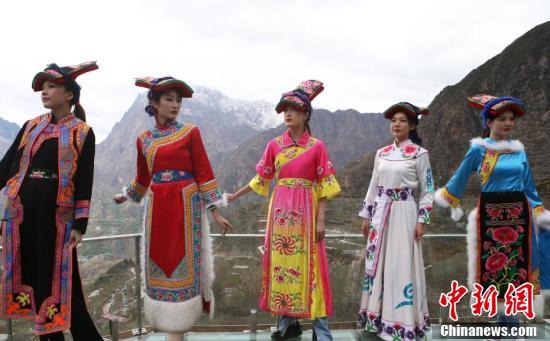 4月1日,甘肃省宕昌县古羌山寨举行2021山湾梦谷羌族文化盛典系列活动,应邀来的国际旅游小姐大赛获奖佳丽展示羌族民族服饰及晚装。