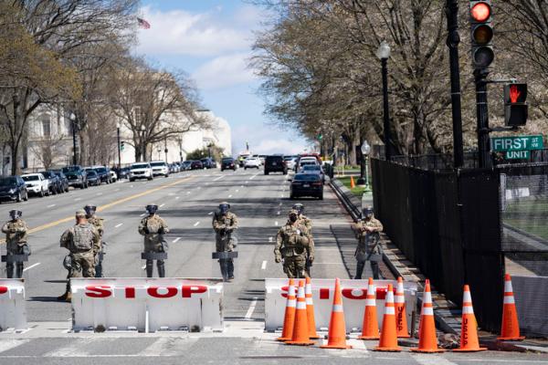 4月2日,美国国民警卫队队员在华盛顿国会附近警戒。新华社记者刘杰摄