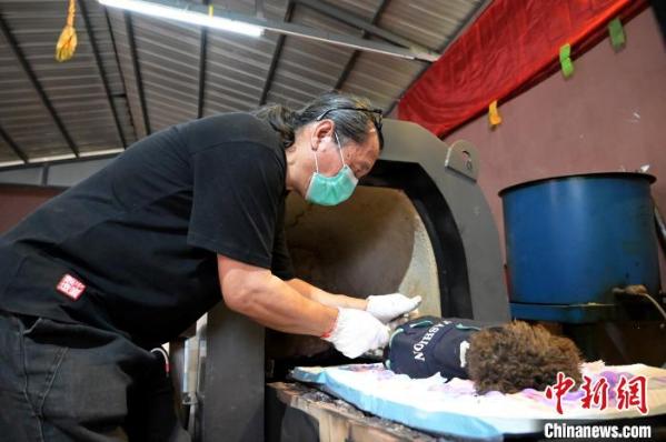 来自台湾台北的李诚宗与妻子朱继红在南宁共同经营着一家宠物庄园。图为李诚宗给宠物进行火葬。 俞靖 摄
