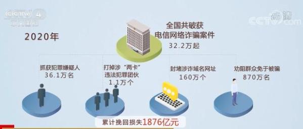 去年以来,全国公安机关综合施策,全链条打击电信网络诈骗犯罪。2020年,全国共破获电信网络诈骗案件32.2万起,抓获犯罪嫌疑人36.1万名,打掉涉“两卡”违法犯罪团伙1.1万个,封堵涉诈域名网址160万个,劝阻870万名群众免于被骗,累计挽回损失1876亿元。