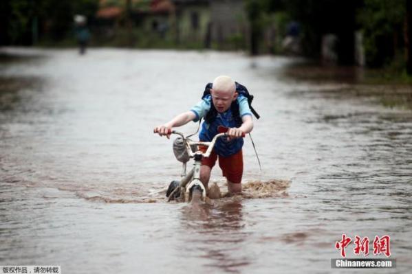资料图:当地时间2020年11月18日,洪都拉斯马可维亚,飓风“约塔”过境后,一名儿童推着自行车经过洪水泛滥的道路。