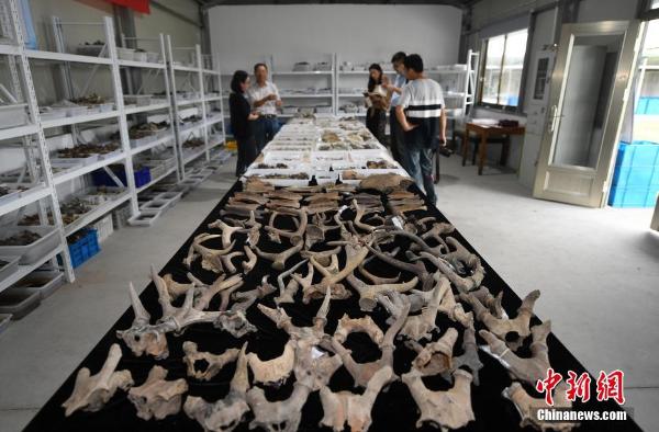 4月13日,2020年度全国十大考古新发现于今日揭晓,具体为:贵州贵安新区招果洞遗址、浙江宁波余姚井头山遗址、河南巩义双槐树遗址、河南淮阳时庄遗址、河南伊川徐阳墓地、西藏札达桑达隆果墓地、江苏徐州土山二号墓、陕西西安少陵原十六国大墓、青海都兰热水墓群2018血渭一号墓、吉林图们磨盘村山城遗址。图为浙江宁波余姚井头山遗址文物库房内摆放大量鹿角、贝壳等。中新社记者 王刚 摄