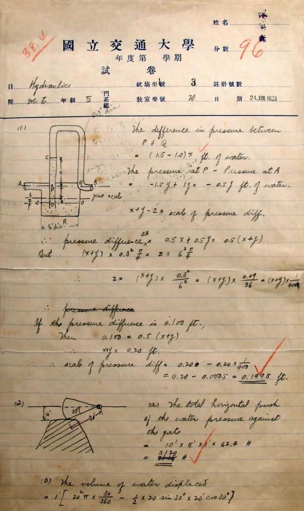 1980年,钱学森大学时期的水力学老师金悫将一份保存了近50年的考卷通过校史研究人员陈贻芳捐给了上海交通大学。这份试卷的卷首时间为1933年6月,课程是水力学(Hydraulics)。这份考卷书写工整,整洁漂亮,连等号“=”都像是用直尺画的一样,文字写得秀丽端庄。