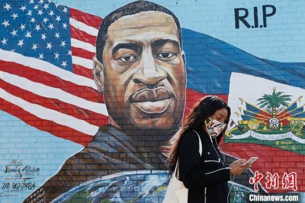资料图:当地时间3月9日,美国纽约布鲁克林区一位市民走过弗洛伊德画像。中新社记者 廖攀 摄