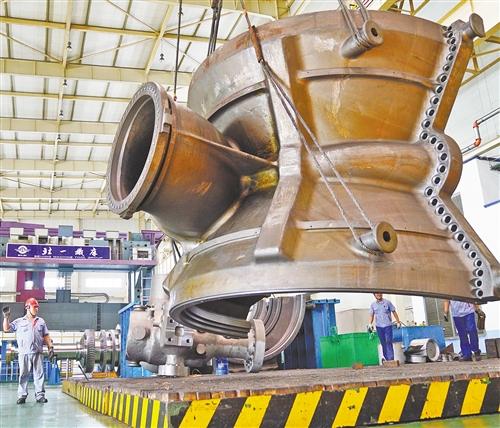 在东北老国企哈电集团哈尔滨汽轮机厂生产车间,工人在进行生产作业(2019年9月3日摄)。 新华社记者 王建威摄