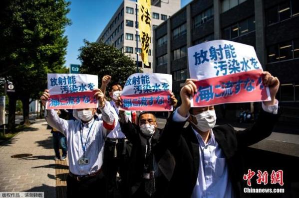 当地时间4月12日,在东京首相府外,当地民众举行集会抗议日本政府计划将受灾的福岛核电站净化水排放入海。