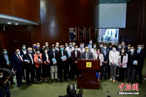4月14日,香港特区立法会加开特别大会,首读及二读《2021年完善选举制度(综合修订)条例草案》。图为立法会议员手持条例草案会见传媒。 中新社记者 李志华 摄