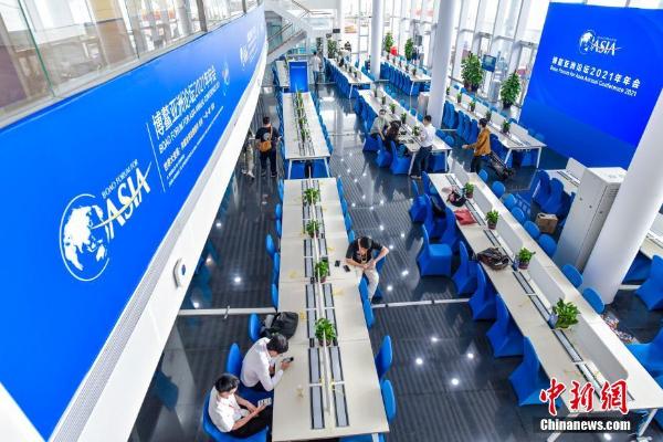 4月17日,博鳌亚洲论坛2021年年会新闻中心启用。博鳌亚洲论坛2021年年会将于4月18日至21日在海南博鳌举行。图为博鳌亚洲论坛2021年年会新闻中心工作大厅。 中新社记者 骆云飞 摄
