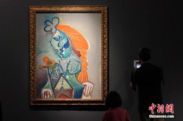 4月17日,2021年香港苏富比春季拍卖展览在香港会议及展览中心举行,大批观众被“神品:超越时空的大师之作”专场拍卖会的拍品吸引。这五件拍品包括毕加索的油画《斗牛士》、常玉的《裸女与北京狗》、张大千的《自画像与黑虎》、宋代木雕加彩观世音菩萨坐像和 阿尔伯托?贾柯梅蒂的铜雕《立柱上的半身小像》等,总估价超过4亿港元。图为观众欣赏毕加索的油画《斗牛士》,该拍品估价1.5亿港元。 中新社记者 张炜 摄