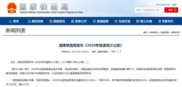 央视网消息: 近日,国家铁路局发布《2020年铁道统计公报》(以下简称《统计公报》)。