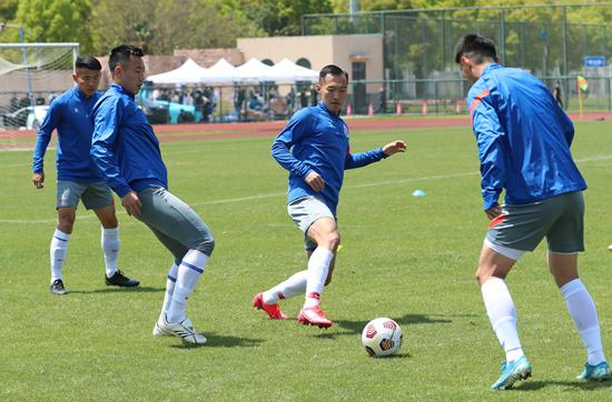 上海申花抵达苏州赛区进行赛前训练,上赛季效力于江苏苏宁的队长吴曦(中)认真备战。 IC供图