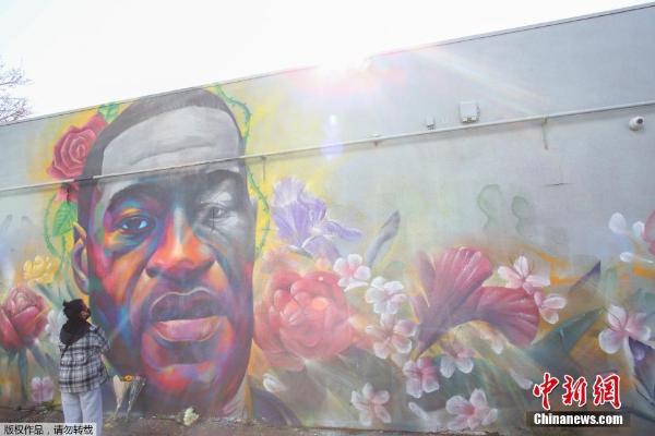 当地时间2020年5月,白人警察肖万在拘捕非裔男子弗洛伊德时,跪颈达9分钟导致弗洛伊德死亡。弗洛伊德濒死呼救称“我无法呼吸”的视频在全美引发大规模抗议。案发后,肖万与当时出警的其他3名警察都遭到解职。图为科罗拉多州丹佛市,一名女子在乔治·弗洛伊德的壁画前表达敬意。