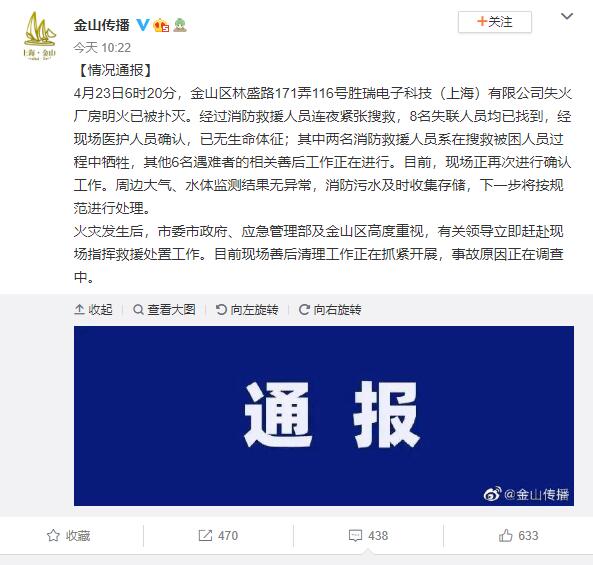 上海金山区人民政府新闻办公室@金山传播 消息:4月23日6时20分,金山区林盛路171弄116号胜瑞电子科技(上海)有限公司失火厂房明火已被扑灭。经过消防救援人员连夜紧张搜救,8名失联人员均已找到,经现场医护人员确认,已无生命体征;其中两名消防救援人员系在搜救被困人员过程中牺牲,其他6名遇难者的相关善后工作正在进行。目前,现场正再次进行确认工作。周边大气、水体监测结果无异常,消防污水及时收集存储,下一步将按规范进行处理。