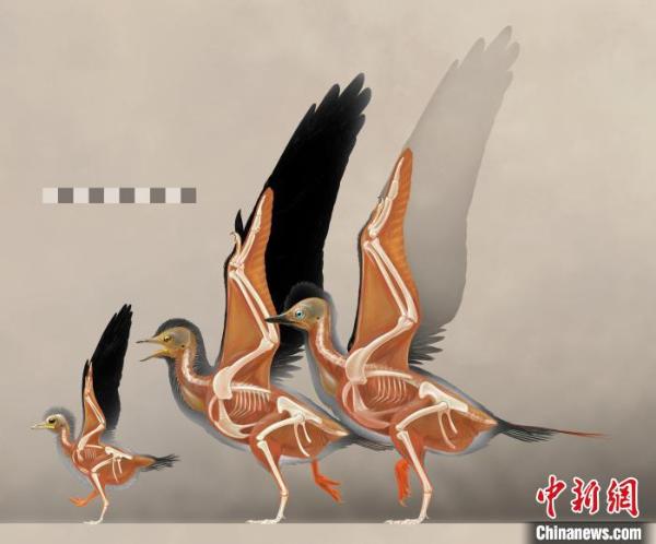 古喙鸟的生长阶段重建 (左侧为本研究的幼年个体)。 研究团队供图