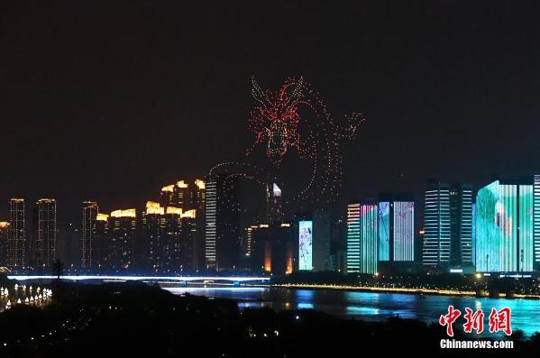 4月24日晚,福建福州,1500架无人机在闽江上空上演了一场高空光影秀,迎接第四届数字中国建设峰会。中新社记者 吕明 摄