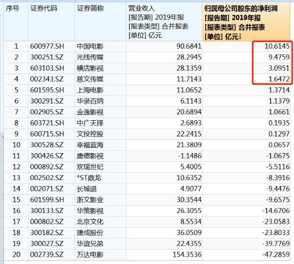 纵使2020年影视公司上述业绩有受到疫情影响的因素在,但对比2019年来看,全年净利润能超过1.6亿元的,也仅有4家,分别为中国电影10.61亿元,光线传媒9.48亿元,横店影视3.10亿元,慈文传媒1.65亿元。