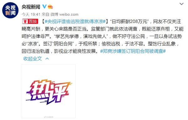 央视新闻官方微博还带话题#郑爽涉嫌签订阴阳合同被调查#发布评论称,谁偷逃税谁就得凉凉。