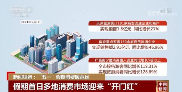 从各地公布的数据来看,假日首日,天津监测统计的191家商贸流通企业和商户实现销售1.8亿元,同比增长21%;南京重点监测的150余家商贸流通企业实现销售额2.91亿元,同比增长46.96%;广西南宁重点商圈人流量同比增长5倍以上,全市接待游客同比增长119.31%,实现旅游消费同比增长128.89%。