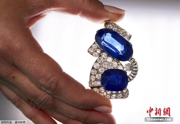 当地时间5月6日,在瑞士日内瓦苏富比拍卖行举行的预展上,一名工作人员拿着一枚上世纪30年代的双主石蓝宝石胸针,这枚胸针是拍卖会上出现过的最大的克什米尔蓝宝石。