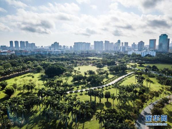 这是5月3日在海口拍摄的万绿园景色(无人机照片)。