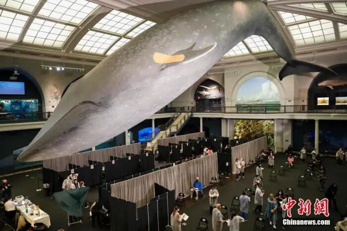 资料图:当地时间4月23日,位于纽约的美国自然历史博物馆开辟米尔斯坦海洋生物大厅为新冠疫苗接种点,为18岁以上的纽约居民接种新冠疫苗。中新社记者 廖攀 摄