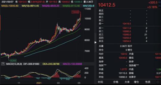 始终最受欢迎的品种铜近期仍涨不停。伦交所(LME)3个月铜期货(最活跃合约)价格在4月的最后一周一度突破每吨10000美元大关,也就在五一假期后的两个交易日,价格已来到了10412.5美元/吨,一举突破2011年2月创下的10190美元的纪录高位。今年迄今,铜价已涨超20%。