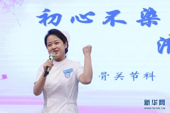 5月10日,北京大学人民医院的一名护士代表在庆祝活动上演讲。当日,北京大学人民医院和中日友好医院举办护士节庆祝和表彰活动,迎接5月12日到来的第110个国际护士节。新华社记者 张玉薇 摄