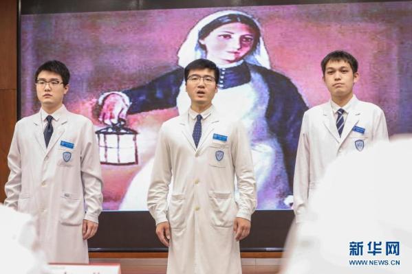 5月10日,北京大学人民医院的男护士代表在庆祝活动上演讲。当日,北京大学人民医院和中日友好医院举办护士节庆祝和表彰活动,迎接5月12日到来的第110个国际护士节。新华社记者 张玉薇 摄