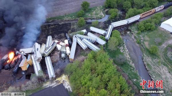 5月18日消息,路透社公布的一段视频显示,当地时间5月16日一列行驶在美国爱荷华州的货运列车脱轨起火,车厢断开散落四周,火车上运送的罐装物质滚落。