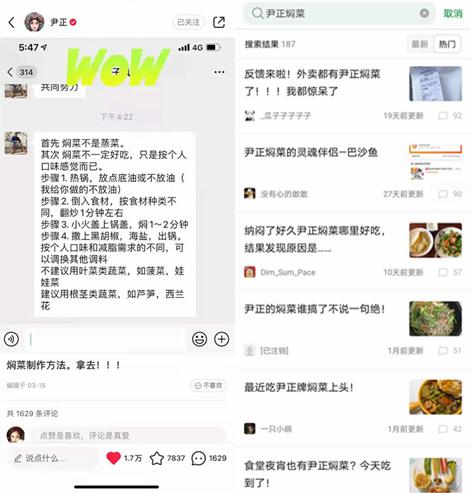 凭借减肥吃播,尹正不仅超越各大明星荣登小红书明星榜榜首,凭一己之力养活了一个豆瓣小组,为许多美食博主和健身博主提供了灵感来源,更是让“尹正焖菜”变成了宫保鸡丁、麻婆豆腐、东坡肉一样的全新菜名。