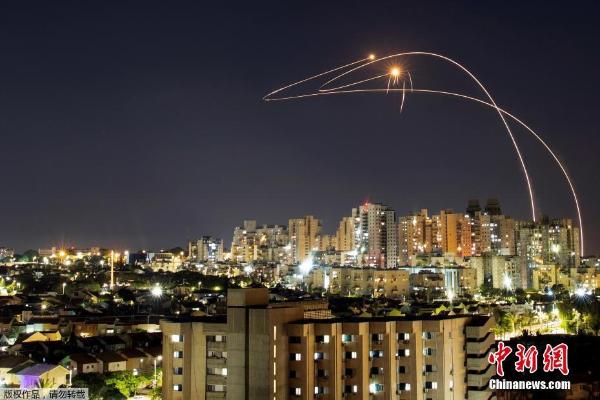 当地时间5月14日,巴以冲突持续升温。图为以色列“铁穹”防空系统拦截从加沙地带向以色列阿什凯隆发射的火箭弹。
