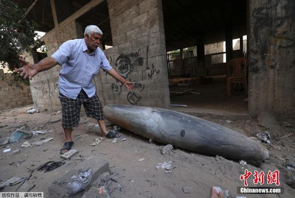 当地时间5月18日,巴以冲突持续,加沙地带一居民区出现一枚未引爆的炸弹。