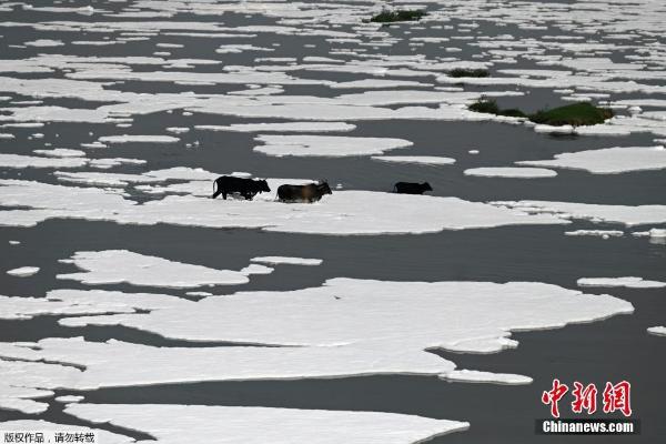 当地时间5月20日,印度首都新德里,恒河最长的支流亚穆纳河遭受严重污染,河面被有毒白色泡沫覆盖。
