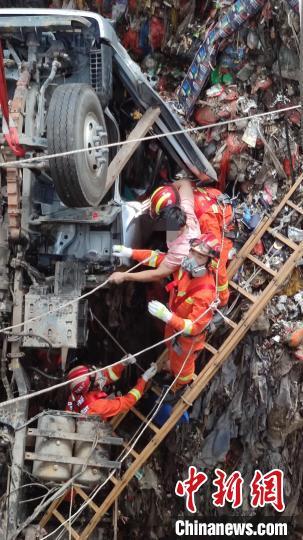 消防救援人员立即展开营救,首先将拉梯架设在事故车辆上,以便开展救援。拉梯架设好后,三名消防救援人员立即穿戴全身安全吊带佩戴防毒面罩,携带救援担架及氧气袋等器材,沿铺设好的拉梯进一步靠近垃圾车进行侦察。侦察发现,现场垃圾松软无法站立,消防救援人员随即在驾驶室旁边加设拉梯,为下一步救援拓宽空间。