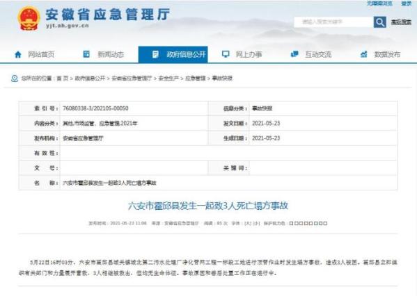 中新网5月23日电 据安徽省应急管理厅网站消息,5月22日16时03分,六安市霍邱县城关镇城北第二污水处理厂净化管网工程一标段工地进行顶管作业时发生塌方事故,造成3人被困。霍邱县立即组织有关部门和力量展开营救,3人相继被救出,但均无生命体征。事故原因和善后处置工作正在进行中。