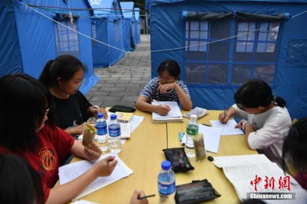 5月22日,云南省大理州漾濞县漾濞一中的高三学生在露天“教室”备战高考。5月21日,当地连发多次地震,最高6.4级。图为几名高三女生围坐在一起复习。 中新社记者 刘冉阳 摄