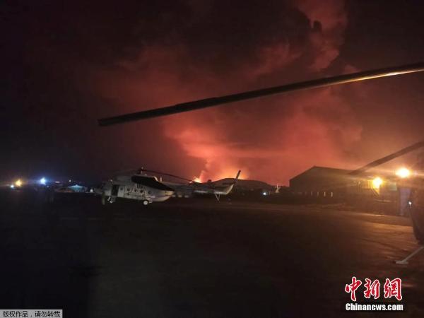 当地时间5月22日,在刚果(金)戈马附近的拉贡戈火山喷发,从戈马国际机场可以明显地看到红光和烟雾。