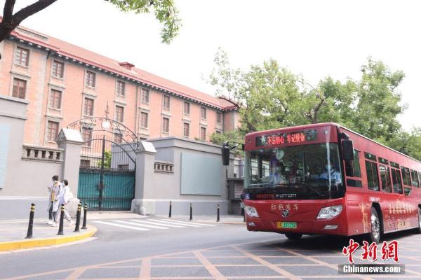 5月26日,北京公交集团开通以“薪火相传 觉醒时代”为主题的“红色专车”,往返于新文化运动纪念馆和李大钊故居之间。图为“红色专车”经过新文化运动纪念馆。 中新社记者 蒋启明 摄