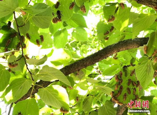 近日,亿万只“17年蝉”破土而出,涌现美国东部地区。17年蝉是周期蝉的一种,为北美独有。周期蝉是世界上最长寿昆虫之一,它们一生大部分时间以蛹的形态在地下生活,以树根为食,不同种类蛰伏时间为13年或17年。 图为5月17日在弗吉尼亚拍摄的17年蝉蝉壳。 中新社记者 陈孟统 摄