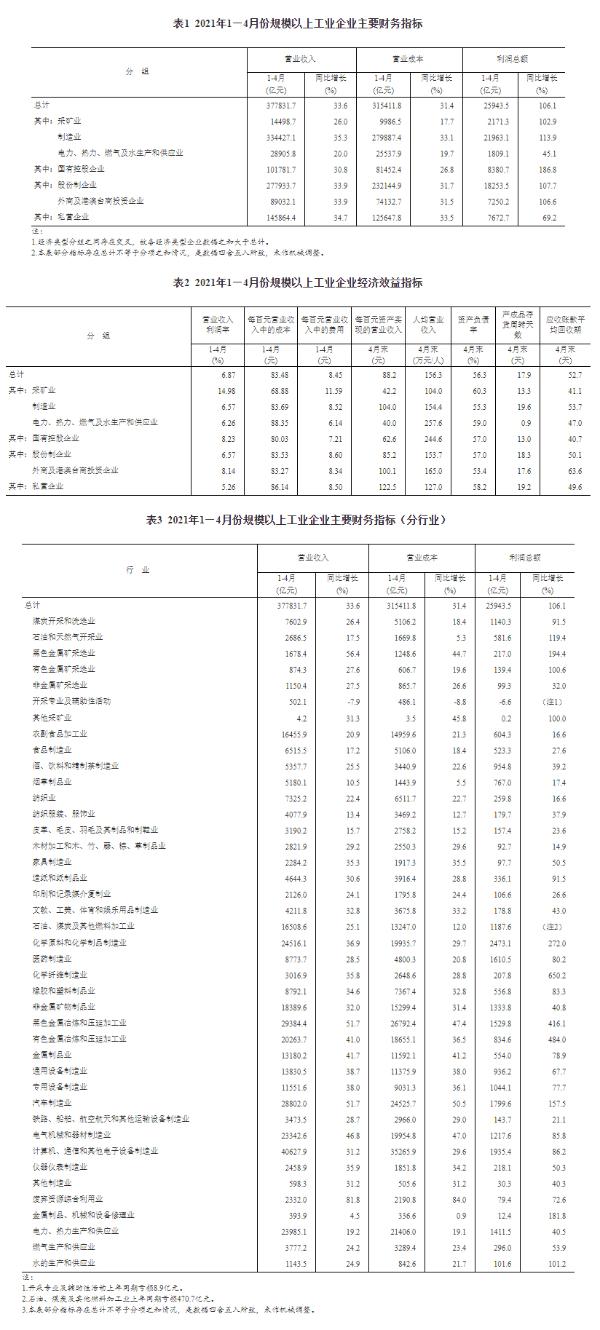1—4月份,在41个工业大类行业中,39个行业利润总额同比增加,1个行业扭亏为盈,1个行业实现减亏。主要行业利润情况如下:有色金属冶炼和压延加工业利润总额同比增长4.84倍,黑色金属冶炼和压延加工业增长4.16倍, 化学原料和化学制品制造业增长2.72倍,汽车制造业增长1.58倍,石油和天然气开采业增长1.19倍,煤炭开采和洗选业增长91.5%,计算机、通信和其他电子设备制造业增长86.2%,电气机械和器材制造业增长85.8%,专用设备制造业增长77.7%,通用设备制造业增长67.7%,非金属矿物制品业增长40.8%,电力、热力生产和供应业增长40.5%,纺织业增长16.6%,农副食品加工业增长16.6%,石油、煤炭及其他燃料加工业由同期亏损转为盈利。