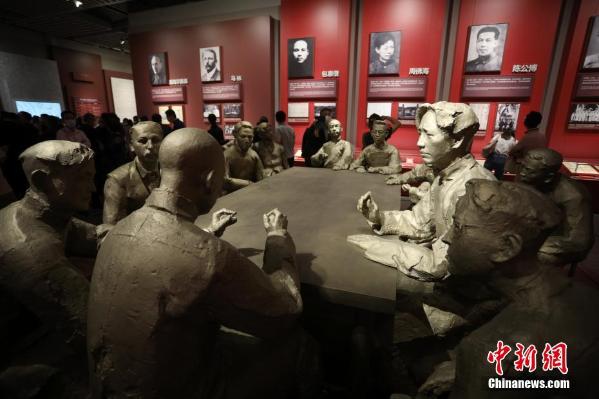 6月3日,位于上海的中国共产党第一次全国代表大会纪念馆全新开放,“伟大的开端——中国共产党创建历史陈列”共展出612件展品,很多平时难得一见的珍贵照片、珍贵文物集中亮相。图为铜像雕塑再现了当年一大会议的情景。 中新社记者 张亨伟 摄