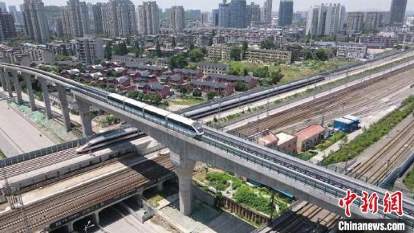 6月7日,在安徽省芜湖市,热滑中的单轨列车与高铁“交汇”。 梁彬歆 摄