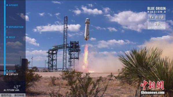 资料图:当地时间2018年4月29日,美国得克萨斯州范霍恩附近,美国蓝色起源公司再次成功试飞并回收升级版“新谢泼德”亚轨道飞行器。(视频截图)