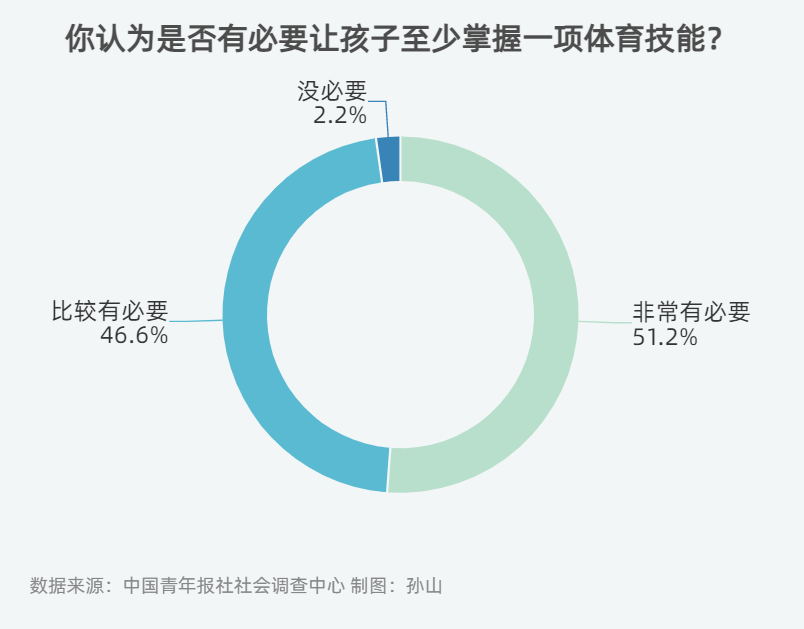 调查中,97.8%的受访家长认为有必要让孩子至少掌握一项体育技能,其中51.2%的受访家长认为非常有必要。